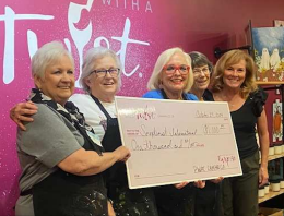 President JuliAnn (far right) and members of the STOP Trafficking Committee showing off the big donation check from the fundraiser at Painting with a Twist in Camarillo in November.